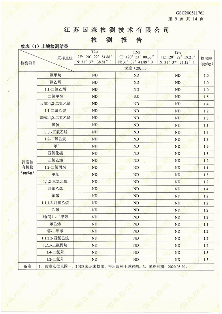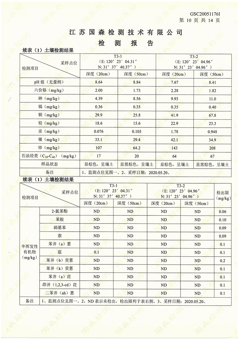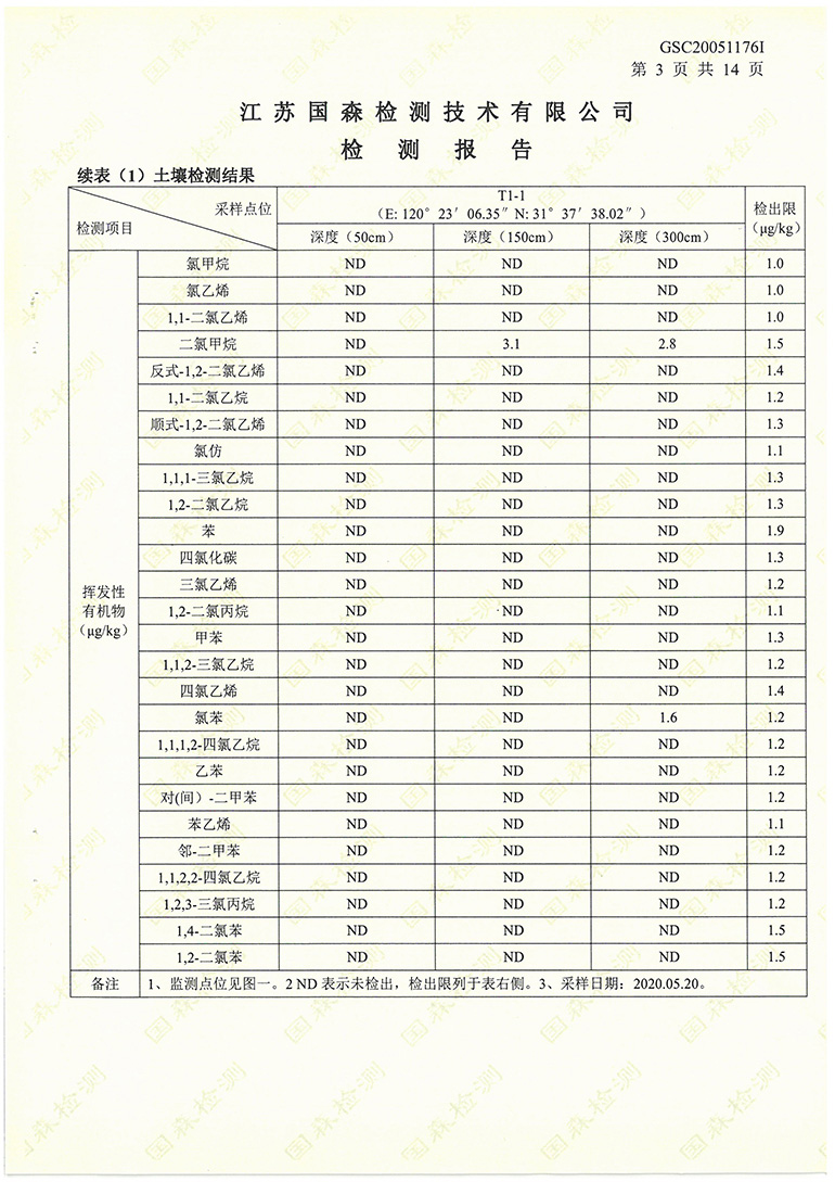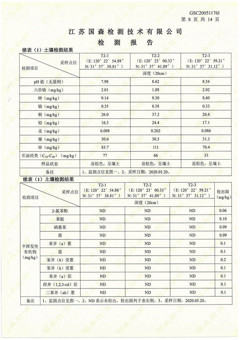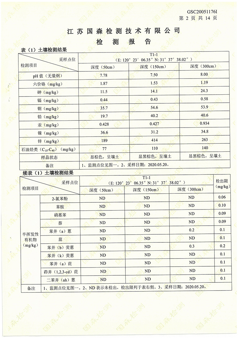 我公司在2020年委托江蘇國森檢測技術(shù)有限公司進(jìn)行了土壤環(huán)境檢測,現(xiàn)根據(jù)國家法律法規(guī)的要求對檢測報告進(jìn)行公示: